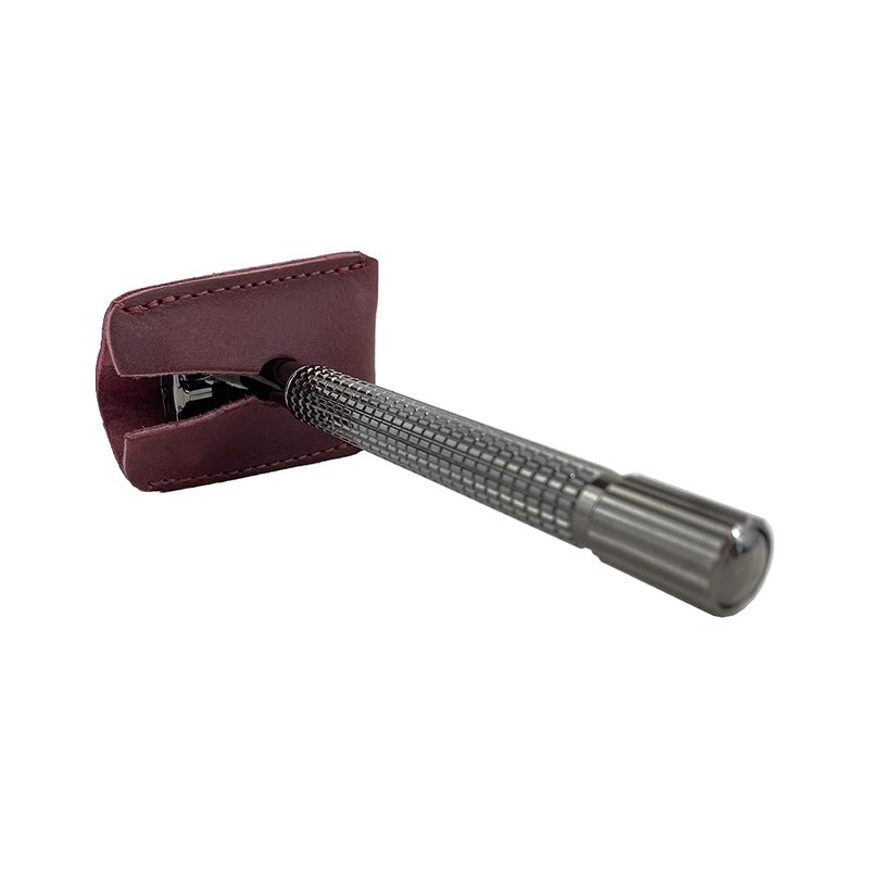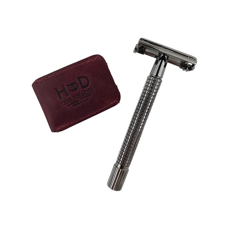 Hide & Drink, Funda protectora de cuero de doble filo para cabeza de afeitar, hecha a mano (sangría)