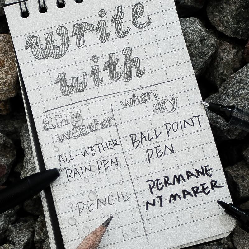 - 【Write in the Rain】You may think the waterproof notebook made of stone paper is rough, but please look forward to the silk-like smooth writing feeling brought by mineral stone paper. When writing in the Rain, please use pencil ballpoint or all-weather pens, water-based ink will drip from the paper pages.