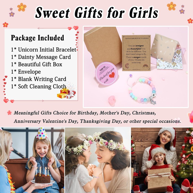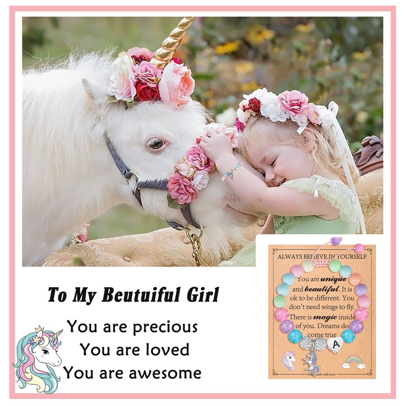 - Material & Size: The unicorn bracelet was made of the highest quality components, Including adjustable pink rope, acrylic beads and rhinestone balls, heart initial, and an exquisite unicorn charm. Girth adjustable from 6 - 10 inches