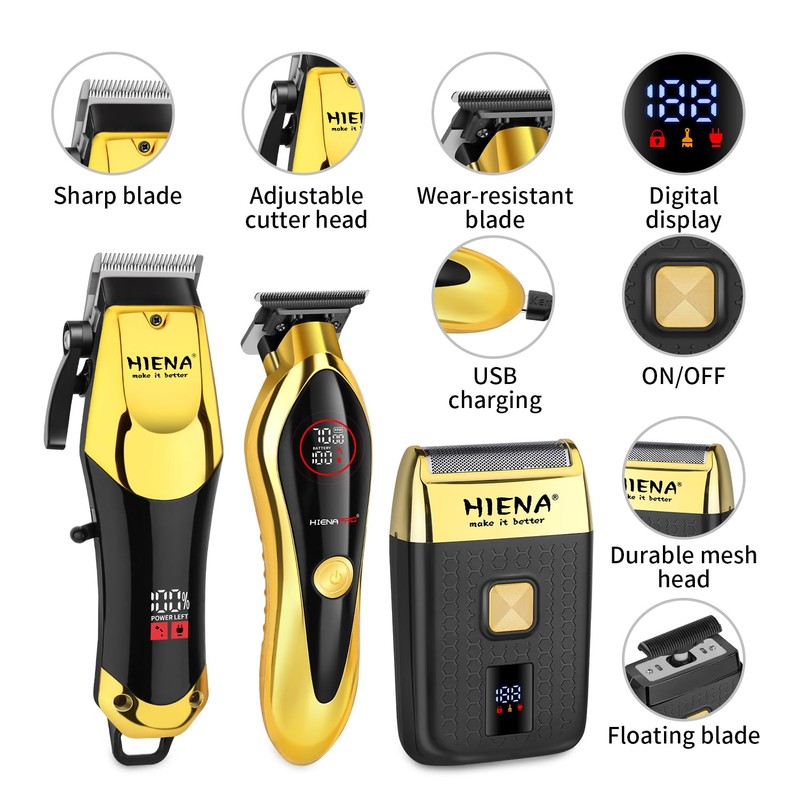 - Durable and Beautifully Designed: our HIENA PRO hair clipper and trimmer set professional and barbers are ergonomically designed for stability and comfort, reducing wrist fatigue and making it easy to comb your hair for long periods of time. The all gold coloured design is even a perfect gift for boyfriend, father, and friends