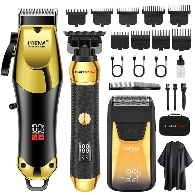 HIENA PRO Professional Cordless Hair Clippers for Men, T-Blade Beard Trimmer & Foil Shaver Set, Rechargeable Barber Clipper Kit and Hair Cutting Set, Facial Grooming Kit with LED Display