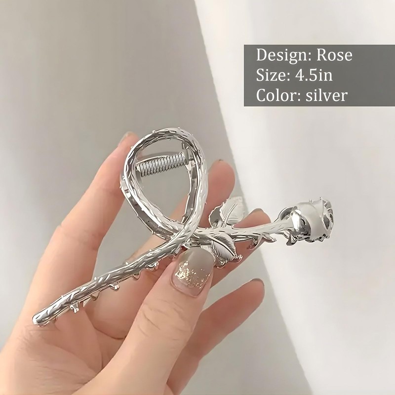 HIFANMM Flower Hair Clips Metal Alloy Hair Accessories for Women Girls, Silver Rose Hair Claw Clips Fashion Spring Summer Hairpins Shark Strong Hold Non Slip Large Jaw Hair Claw Clip 1 Pcs