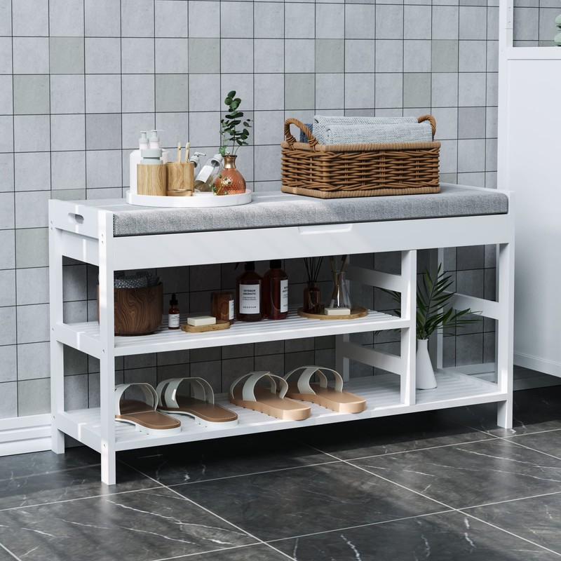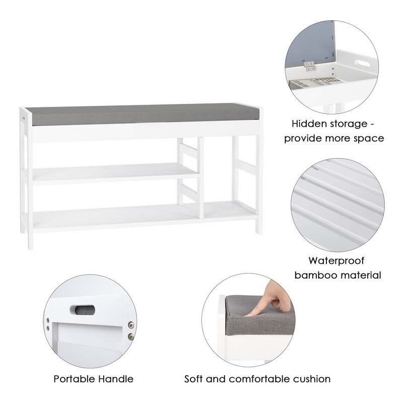 HIFIT Bamboo Shoe Bench Rack with Storage, Entryway Storage Bench with Padded Seat, Shoe Oiganizer Shelf for Entryway Mudroom Bathroom, White