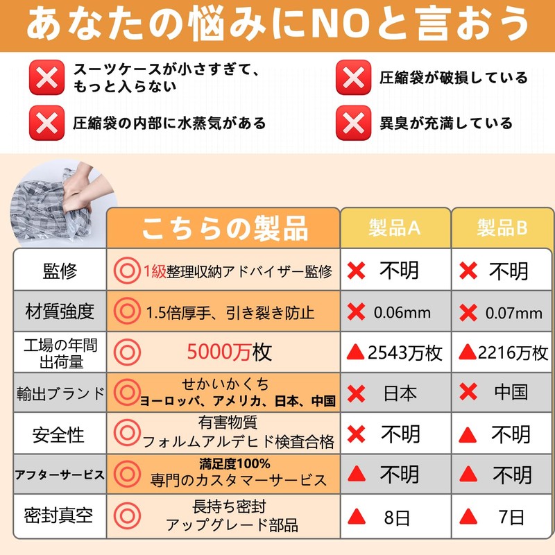 • THICK, TEAR RESISTANT, REUSABLE COMPRESSION BAGS: The double layer construction of polyethylene + nylon makes it 1.5 times thicker than conventional products. Tear resistant and durable 3 to 5 times longer for long time use Also, it has been tested for harmful substances and formaldehyde, so it can be safely used on small children's clothing