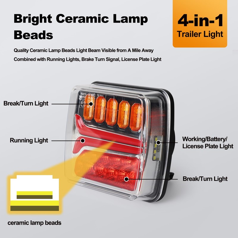 - PERFECT VISIBILITY: The trailer lights adopt quality premium ceramic lamp beads , features high brightness, low-power consumption, lights responsive to the vehicle, which can be seen up to a mile away, using life-time up to 60,000hrs. The magnetic trailer lights combined with running lights, brake light, turn signal, and license plate light, consistent with the front lights to improve driving safety at night.