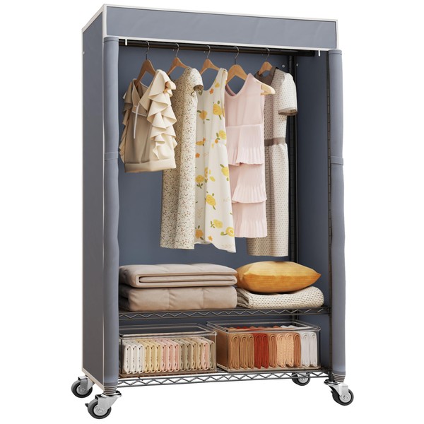 Higeego H4 Heavy Duty Clothes Rack with Cover, Rolling Garment Rack, Wardrobe with Cover and Wheels, Closet Organizer Shelf, Portable Closet Organizer and Storage, Black Clothing Rack with Grey Cover