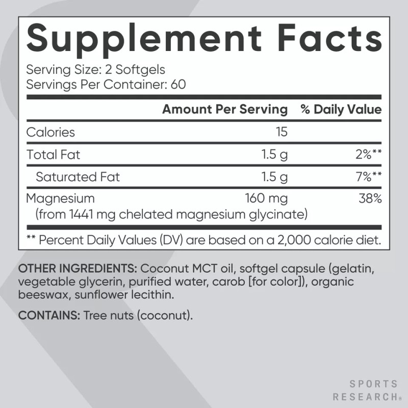 Sports Research® highly bioavailable Magnesium Glycinate is a once-daily way to receive valuable 5-in-1 heart, bone, energy, enzyme, and sleep support.* Every serving offers 160 mg of high-quality chelated material for superior bioavailability and is enhanced with Sunflower Lecithin and Coconut MCT Oil to aid absorption. Our Magnesium Glycinate supplement comes in a vegan-friendly veggie capsule or liquid softgel and is non-GMO project verified and gluten-free. And, because we create products that cater to everybody, you can rest assured that you’re consuming a gluten-free, cGMP-compliant supplement free of artificial fillers, colors, or sweeteners.