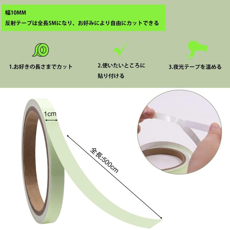 - 【Package】Package includes 20mm*5m green fluorescent tape, can be cut and illuminated without turning on the power supply, so it can be used for a wide range of applications