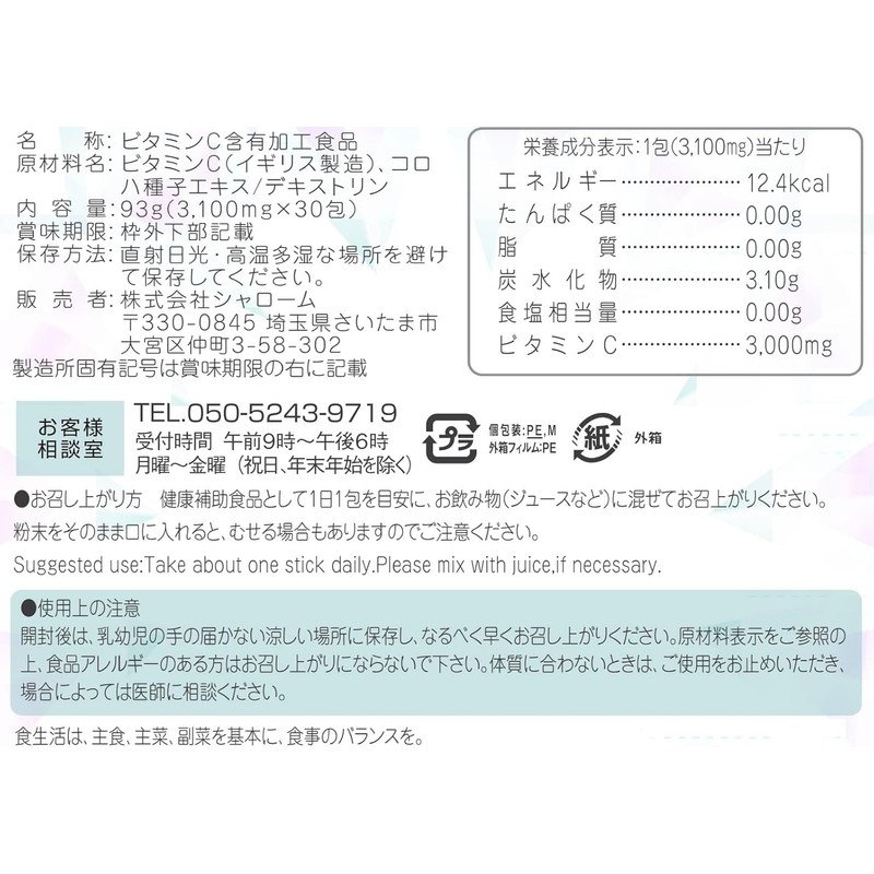 - ✅ [❗Vitamin C content of over 96%! A highly concentrated supplement containing 3000mg of vitamin C per packet❗] VC contains over 96% vitamin C, so you can consume vitamin C without any unnecessary ingredients.