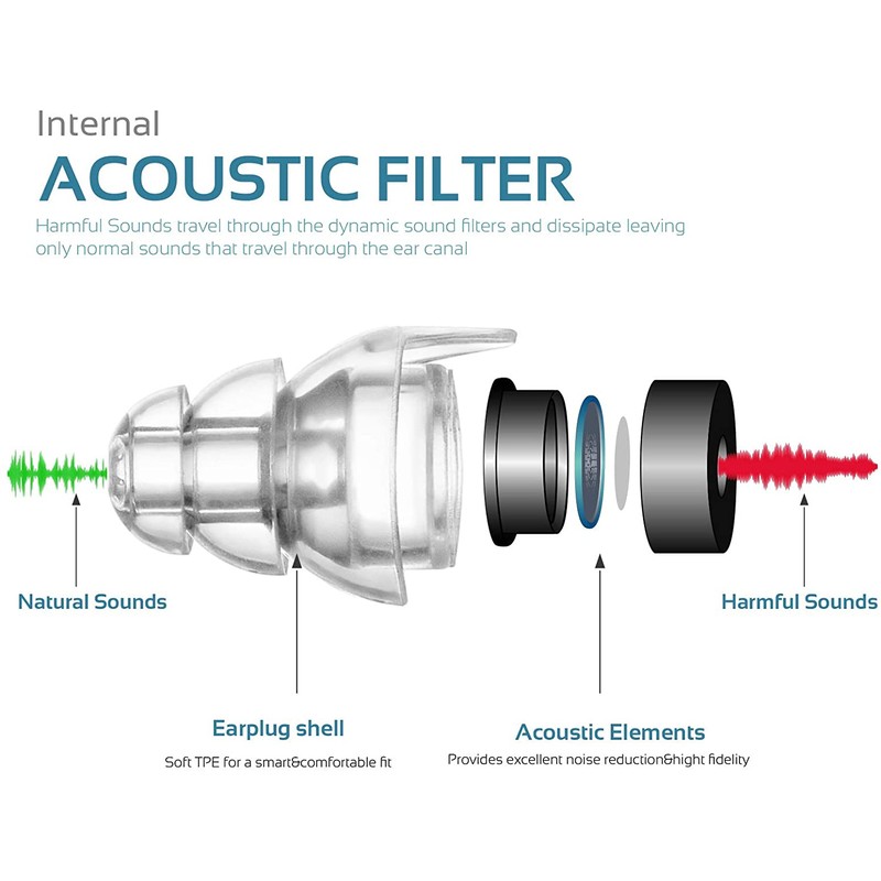 - ADVANCED FILTER TECHNOLOGY reduces noise (up to 24dB,NRR)evenly to maintain the full spectrum of sound while protecting hearing. Mumba concert earplugs deliver crisp, clear sound at a safe volume. Won’t muffle music or voices as foam plugs do. Suitable for Concerts, Musicians, Drummer, Percussion, DJs