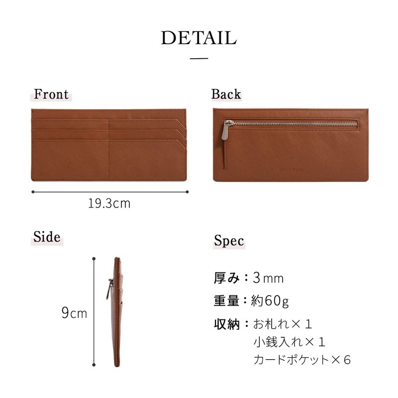 Brand: High Five (Specifications) Bill holder x 1, Coin purse x 1, Card pocket x 6, [Size] (H x W x D): 3.5 x 7.6 x 0.4 inches (90 x 193 x 10 mm), Weight: 2.3 oz (60 g), Outer PU Leather, Inner Cloth: [Minimal] The thinnest part is 0.1 inches (3 inches (3 mm) No jammy. Thin yet holds bills and cards securely. The coin purse uses a one-sided gusset construction to ensure ease of use and capacity. Weighs only 60g. Also perfect for sub wallets. (Fine Saffiano Treatment) Made with PU Saffiano that has a nice texture and luxurious feel. Resistant to water, scratches, and stains, and easy to clean. A lineup of 7 popular colors for both men and women. You can choose from a cute, stylish, cool, casual, business, or formal style. Recommended as a gift for anniversaries, Mother's Day, Father's Day, Valentine's Day, White Day, birthdays, Christmas, etc. black / navy navy navy / camel camel / grey grey / greige gage / dustypink dusty pink / lavender