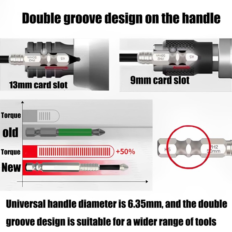 - 【Anti-slip Design】: Comfortable grip and efficient transmission The hexagonal anti-slip groove at the end of the screwdriver head fits tightly with the tool buckle, reducing idling slippage and more direct power transmission. Precise 1/4 inch (6.35 mm) quick-change interface, quick installation, no additional conversion head required.