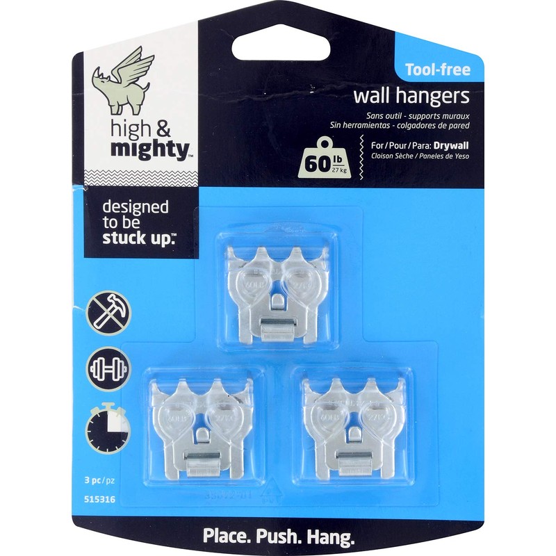 What has two thumbs and can hang anything? You do. HIGH & MIGHTY wall hangers are easy to install without a single tool—simply place, push, and hang. With just your thumbs, you can quickly go from inspiration to installation. Our hangers come in a variety of weights so there's a solution for anything you want to hang, no matter how big. Pictures, mirrors, wall decor, or even a gallery wall go up in seconds. Removing or replacing HIGH & MIGHTY is easily done with a flathead screwdriver or something similar, leaving holes barely bigger than a pin. Designed for use with sawtooth and ring style mounts or picture wire. With this value 3-pack, hang up to 60lbs on each hook and show off your family photos, artwork, clocks, diplomas, and other home décor. Will also hang many office cork boards, chalk boards, and dry-erase board frames. For use on drywall only.