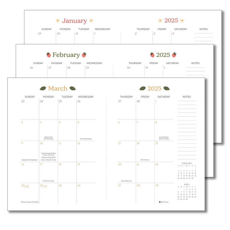 - 17 months of planning: August 2024 - December 2025; monthly planning grids and weekly calendar grids, year-at-a-glance 2025 and 2026 overview grids, holidays and moon phases noted