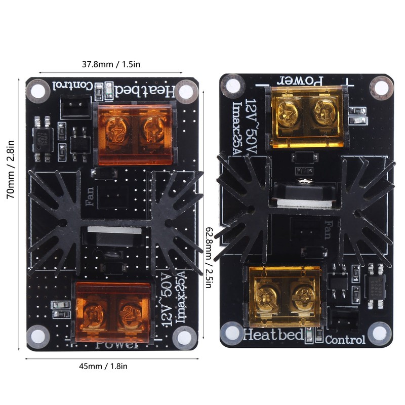1、Hot bed high‑power expansion module, small appearance, easy to carry and store, convenient to use and with good performance. 2、Unique snowflake heat sink design, strong heat dissipation, solve the problem of battery load due to excessive heating bed power. 3、Under normal heat dissipation, this module can work stably for a long time when measured(maximum)‑25A. 4、During use, the current should not exceed 25A as much as possible, 12V can use 360W, 24V can use 720W. 5、Made of high-quality materials, strong and durable, has a long service life.