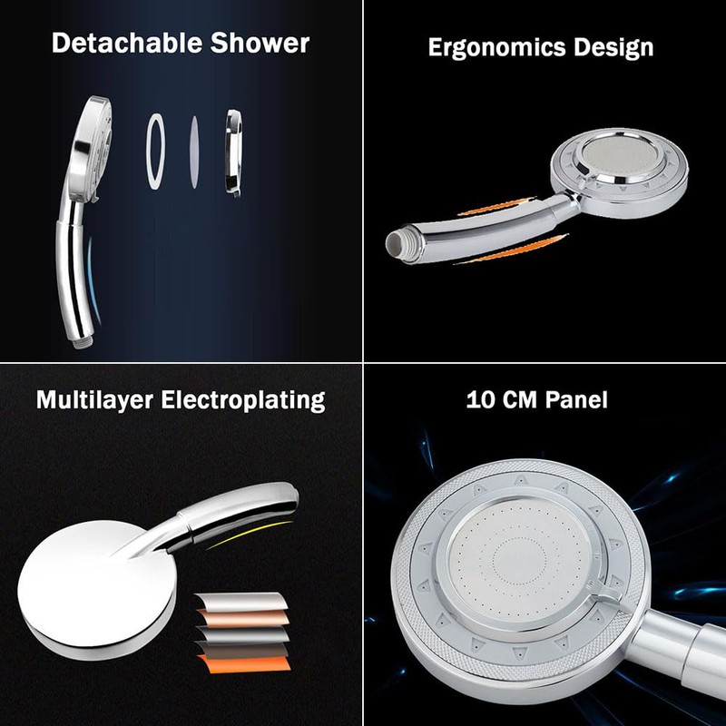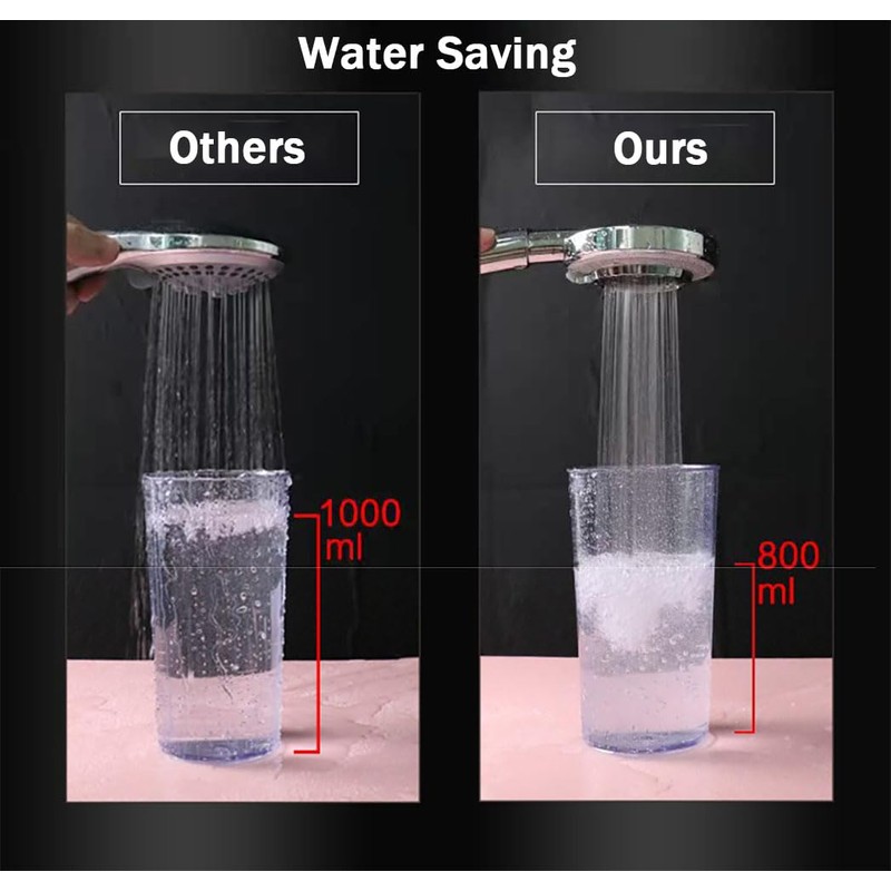 High pressure &Water saving: This handheld shower head with a unique internal space structure and pressure boosting technology. Save more water while ensuring high pressure water delivery, Please see our image.