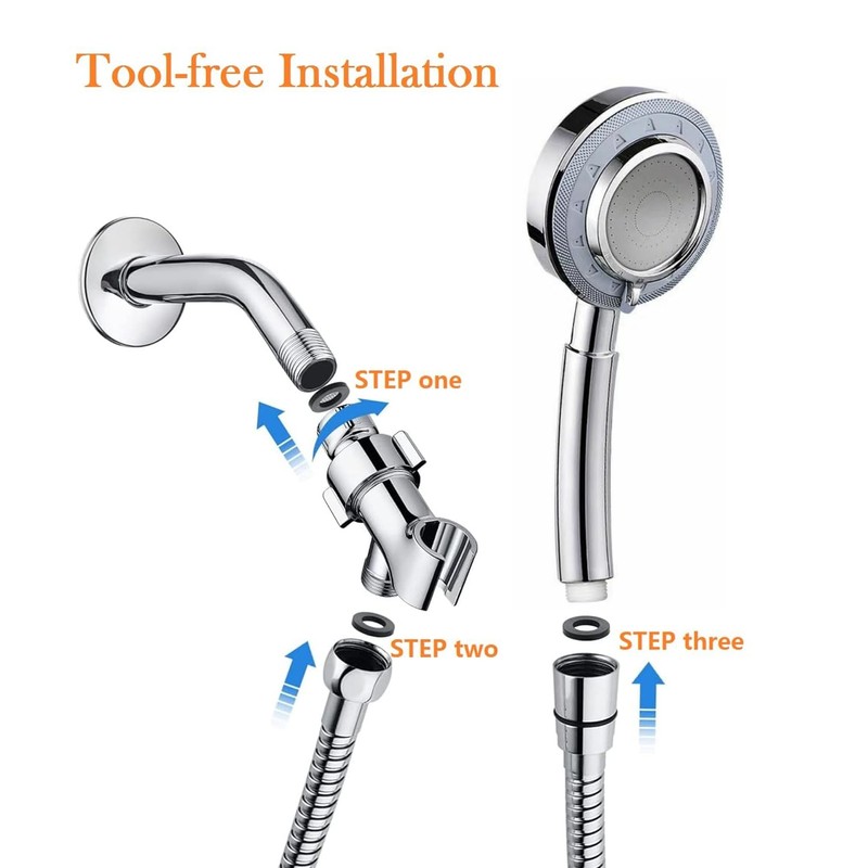 Shower Head With Hose And Adjustable Holder: This High Pressure Shower Head Set with 60" hose and Heavy-duty Stainless Steel Hose adds reach and mobility, which is anti-rust, anti-twist, anti-leaking. You can freely adjust the angles and directions as your desire for hands-free operation with its Angle-adjustable overhead bracket