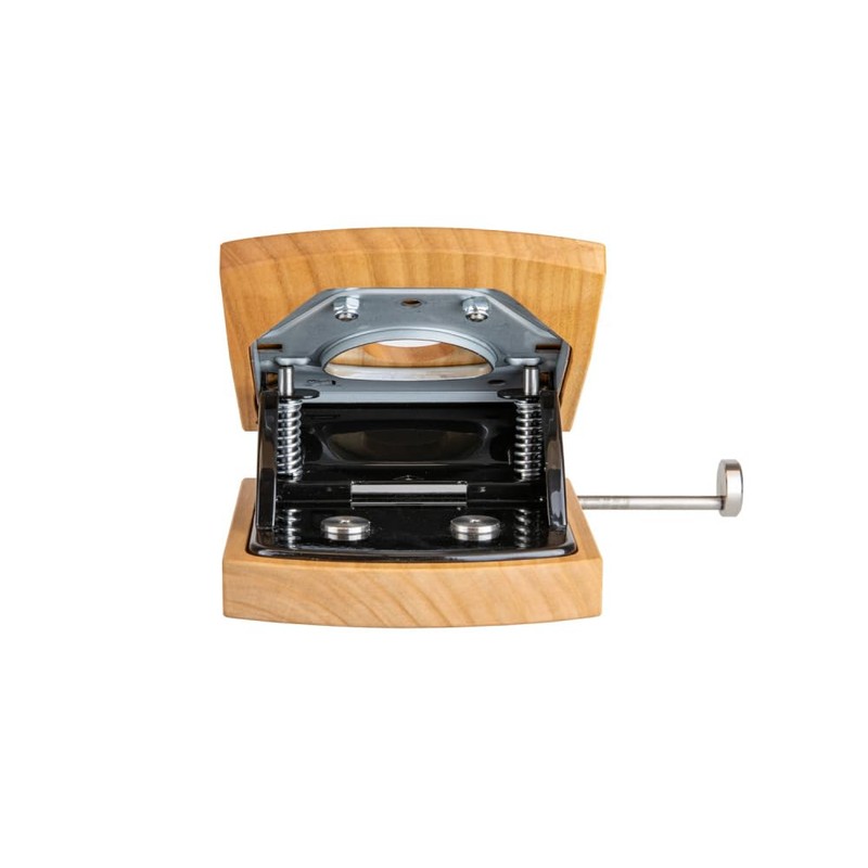 The individual elements made of wood and stainless steel are firmly screwed together. The metal plate on the bottom sticks to two strong magnets. If necessary, i.e. to empty the perforated circles, the plate is removed. To do this, you grab under the plate with your finger on the groove and lift it off. After emptying, you put the plate back on and the magnets hold it again.