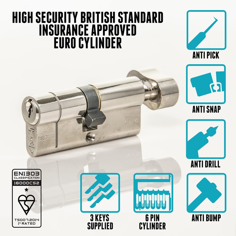 • Application - Suitable for all Types of Doors and Locks that take Euro Cylinder Locks. The Security Features of our Euro Lock Cylinder are on both sides of the TS007 Lock meaning it can be fitted either way around. The Thumb Turn Feature allows the user to easily lock & unlock the Door from the Inside without the need for a Key.