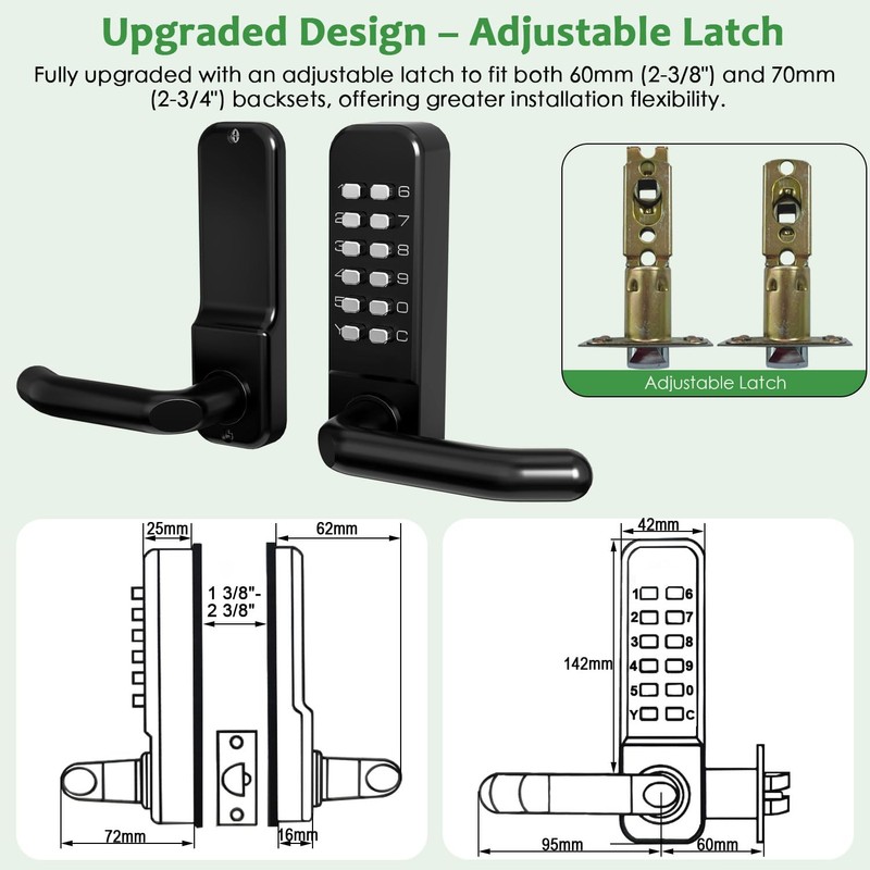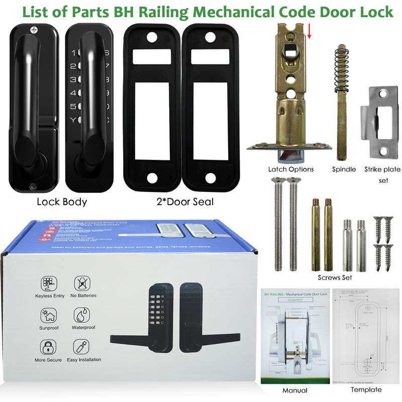 • 【Wide Application Range】Mechanical keyless entry door lock is designed for doors with a frame spacing of both 60mm(2-3/8 inches) and 70mm(2-3/4 inches)with our adjustable deadbolt. It is compatible with doors ranging in thickness from 1-3/8 inches to 2-3/8 inches (35mm to 60mm) and is not suitable for glass doors. BH RAILING, a professional manufacturer, is committed to providing high-quality products and excellent customer experience. If you have any questions about the product, please feel free to contact us.