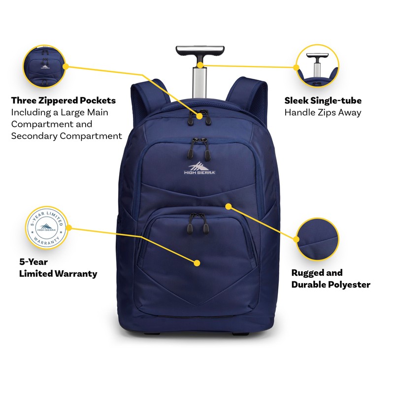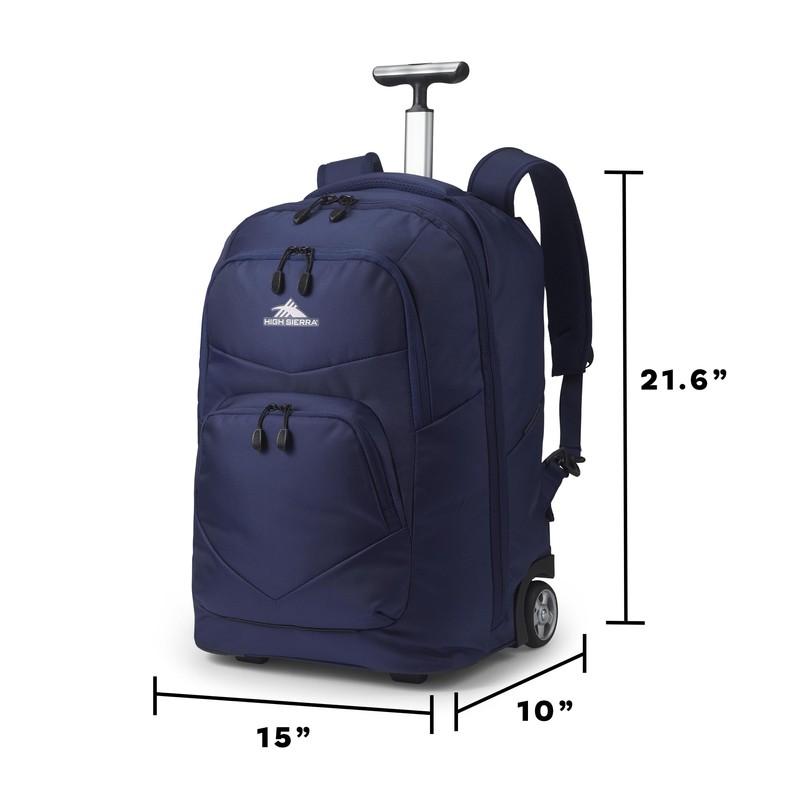 - Main compartment can comfortably fit your things with an external pocket and dual side personal pockets for easy access; Rotating handle and smooth-rolling wheels turn the backpack into a rolling cart