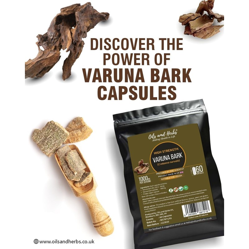 - Each serving contains 1000mg of Varuna Bark goodness. Formulated with Varuna Bark Extract (10:1) and Varuna Bark Powder.Filled in convenient vegan capsules. Gluten and soya-free for dietary versatility.Free from filler, binders, sugar, artificial colors, and flavors. Suitable for vegans, supporting diverse lifestyle choices.Prepared by PhD scientists for optimal quality and efficacy