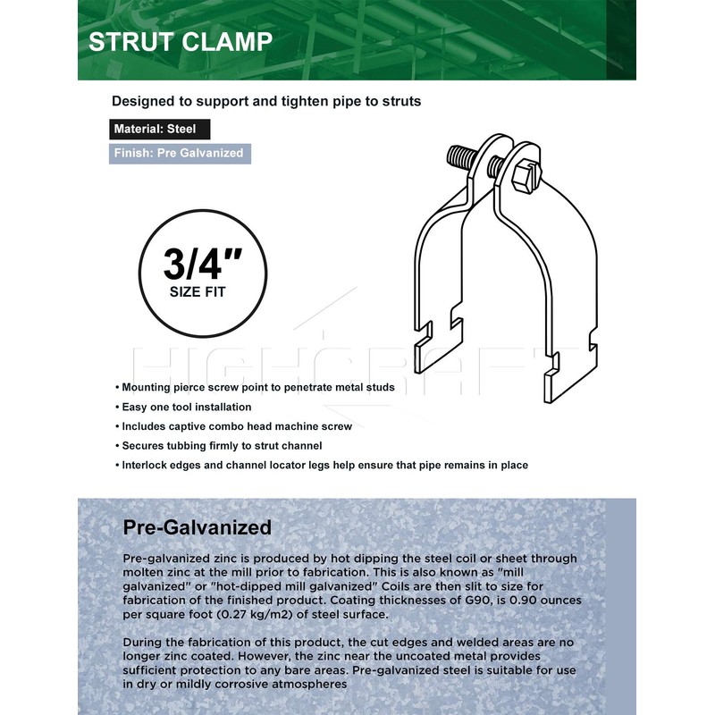 Highcraft CLST-GE34-10 Strut Clamp Electro Galvanized Steel, for 3/4 in. Pipe (PKG=10), Chrome