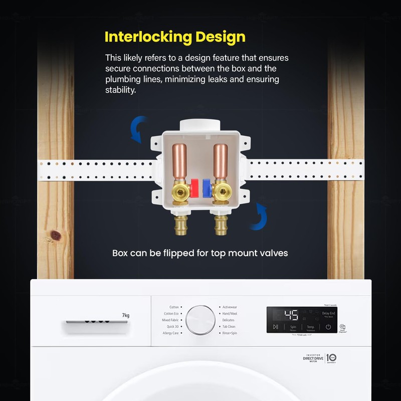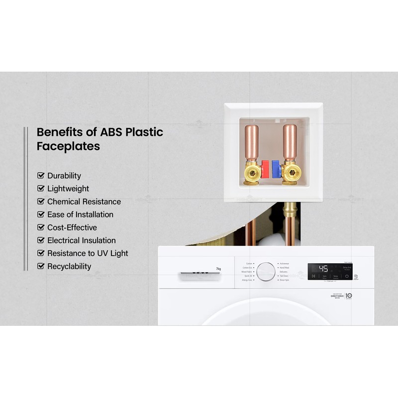 - This Highcraft washer box is made of durable ABS one-piece construction for ultimate leak free protection. It has a sleek compact design and can be linked with more boxes together. The outlet box can be used for washing machines, ice makers ,gas vavles, and air admittance valves