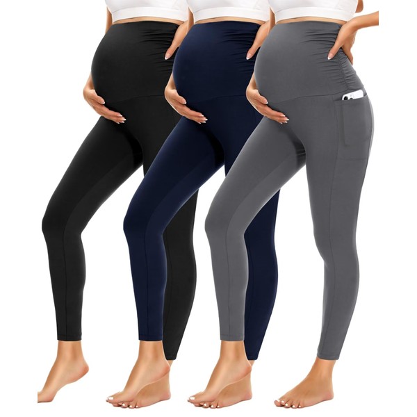 HIGHDAYS Womens Maternity Leggings with Pockets Over The Belly,3 Packs Pregnancy Soft Workout Activewear Yoga Tights Pants