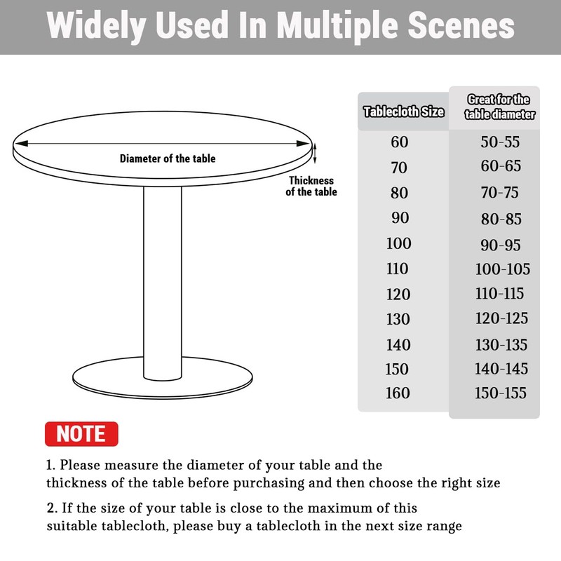 - VARIOUS SIZES We offer tablecloths with diameters from 60cm to 140cm, suitable for round dining tables of different sizes. Please note that you need to measure the diameter and thickness of your dining table before purchasing. The size you choose = table diameter + table thickness x 2