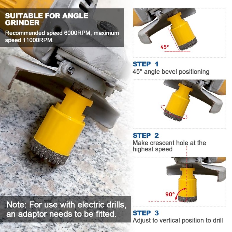 - ✅【Machine】Suitable for angle grinders with 5/8-11 thread. For use with electric drills, an adaptor needs to be fitted. Recommended speed 6000RPM, maximum speed 11000RPM.