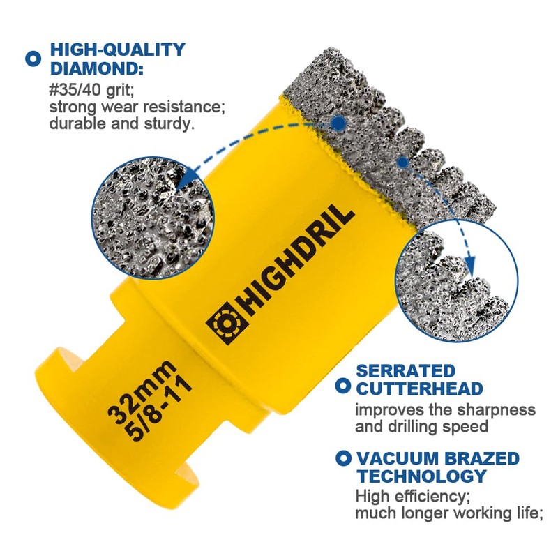 - ✅【Specification】Vacuum brazed diamond drilling bits with 5/8-11 thread. Diameter: 25mm. Diamond height: 10mm, Total length: 60mm. Drilling depth: 35mm. Diamond grit: #35/40.