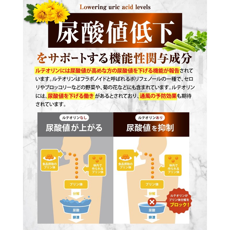 - (Food Registration Indicator with Function Claims) This product includes luthorin. Luteolin has been reported to reduce uric acid value for those with high uric acid levels. (Registration Number: J1061)