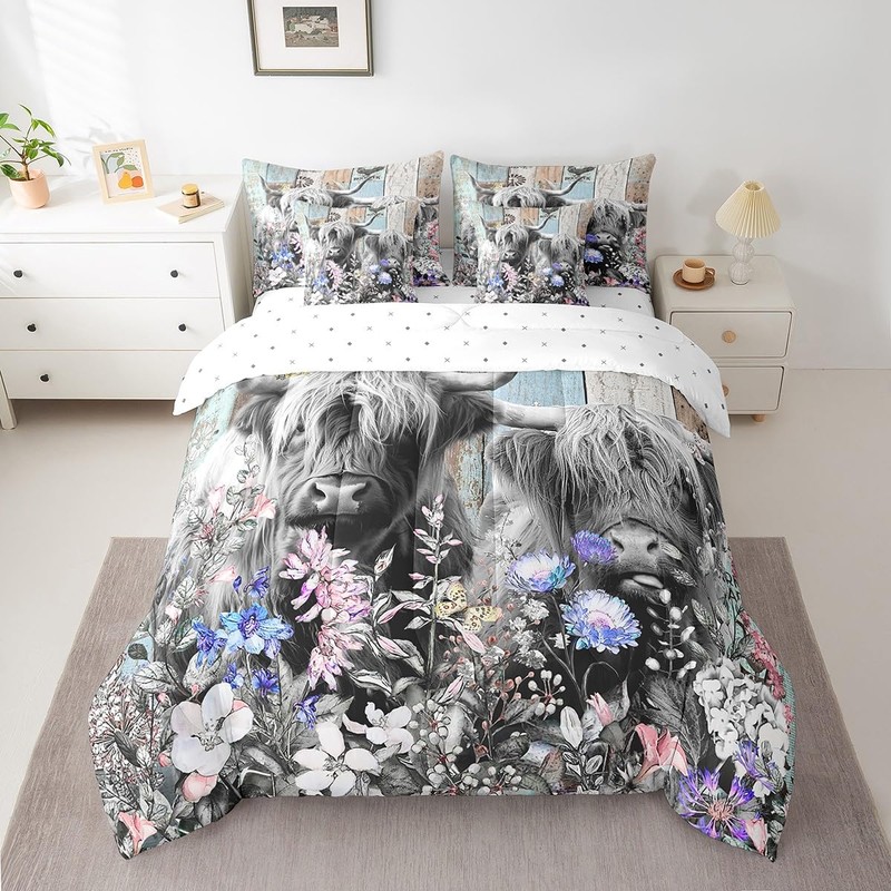 Highland Cattle Kids Comforter Set 7 Piece Twin Size,Farmhouse Cow Wild Animals Flowers Reversible Quilt Set,Rustic Country Wooden Board Bedding Set with Comforter,Sheet,Pillowcase