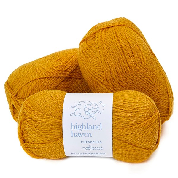 Highland Haven - 100% Highland Wool Yarn Set of 3 Skeins (150 Grams) Fingering Weight - Sourced Directly from Peru - Heavenly Soft and Perfect for Knitting and Crocheting (Fingering, Mustard Gold)