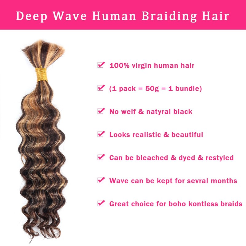 Highlights Braiding Hair Real Hair P4/30 Ombre Deep Water Wave Bulk Real Hair for Braiding No Wefts Curly Hair Extensions for Boho Braids 40 cm 16 Inches Wet and Wavy 50 g 1 Bundle