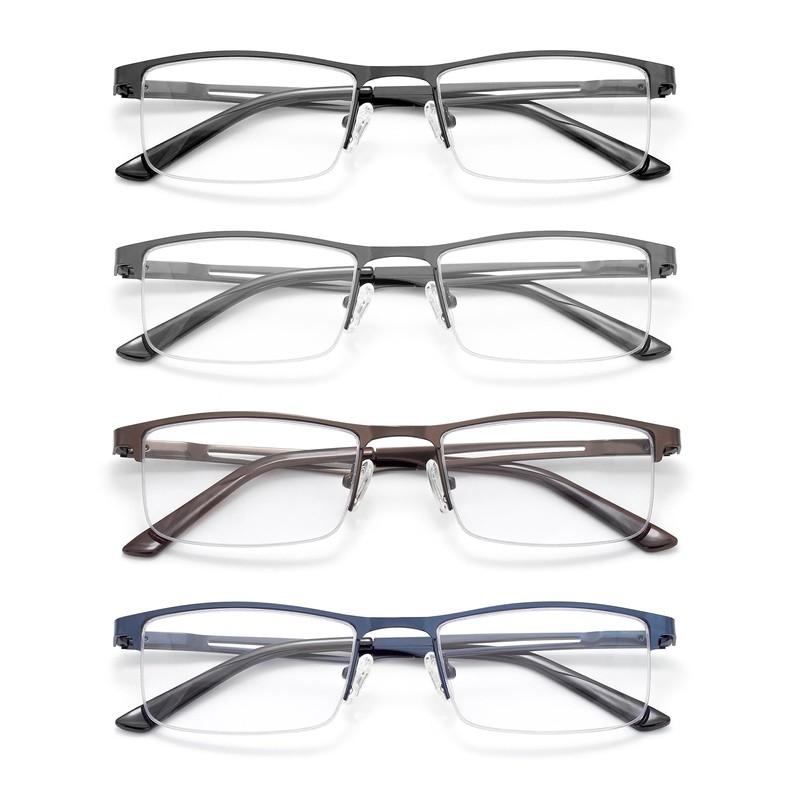HIGHLIKE 4-Pack Blue Light Reading Glasses for Men, Metal Half Frame Readers Spring Hinge Clear Lens Eyeglasses with Pouches, Semi Rimless Black Gunmetal Brown Blue 2.0 x