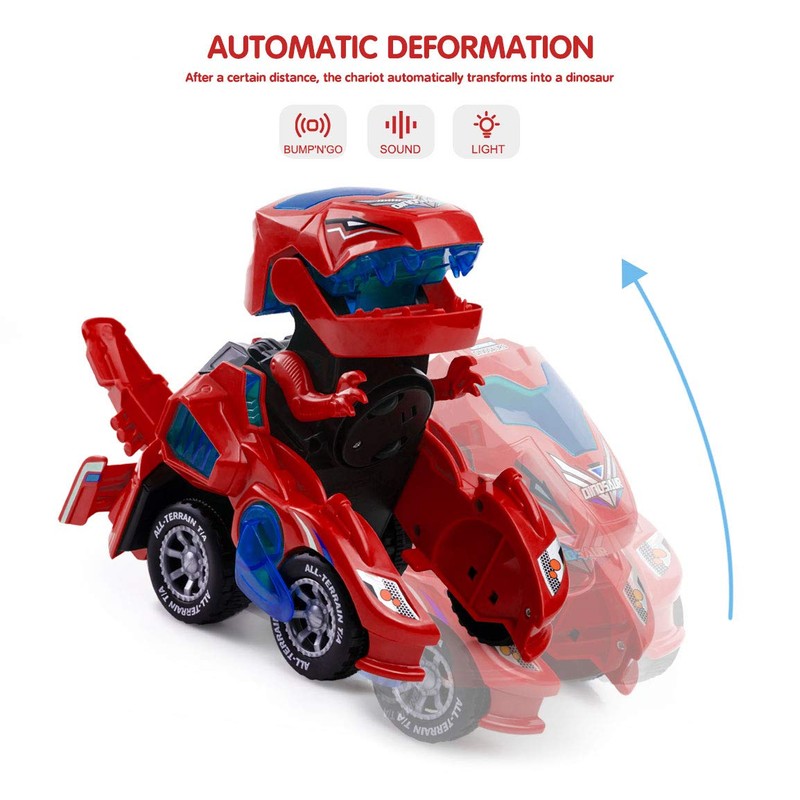 - đă2 in 1 Dinosaur Transforming ToysăIt's a dinosaur and a toy car in one, it can automatically transform into a dinosaur! Just put in 3 AA batteries(not included) and turn it on, then after driving for a while, the car will automatically deform into a dinosaur, then change back into a car and continue driving!
