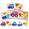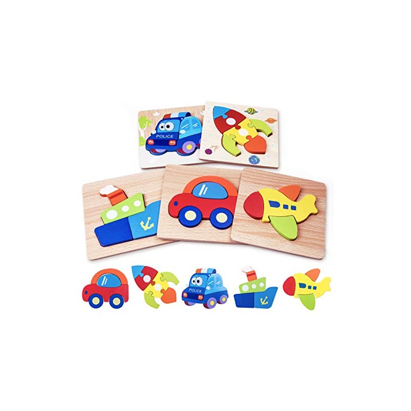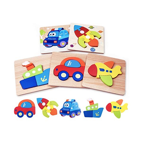 Highttoy Wooden Blocks Jigsaws for 1-3 Year Olds,5 Pcs Wooden Jigsaw Puzzles for Toddlers Kids Age 2-4 Traffic Vehicle Shape Blocks Chunky Puzzle Game Educational Montessori Wooden Toys for Boys Girls
