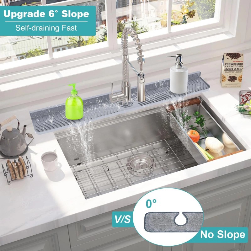 【Upgrade】 While other kitchen faucet sink splash guards are made from hard-to-clean fabric that takes a lot of time to dry, Our silicone faucet water catcher for sink is made from 100% silicone, soft and reliable, reusable and durable, won't scratch your utensils, totally safe to use. Our silicone water catchers will catch the water and the water will drain to your sink, so don't worry about the wet fabric mat, or wash the mat and dry it.