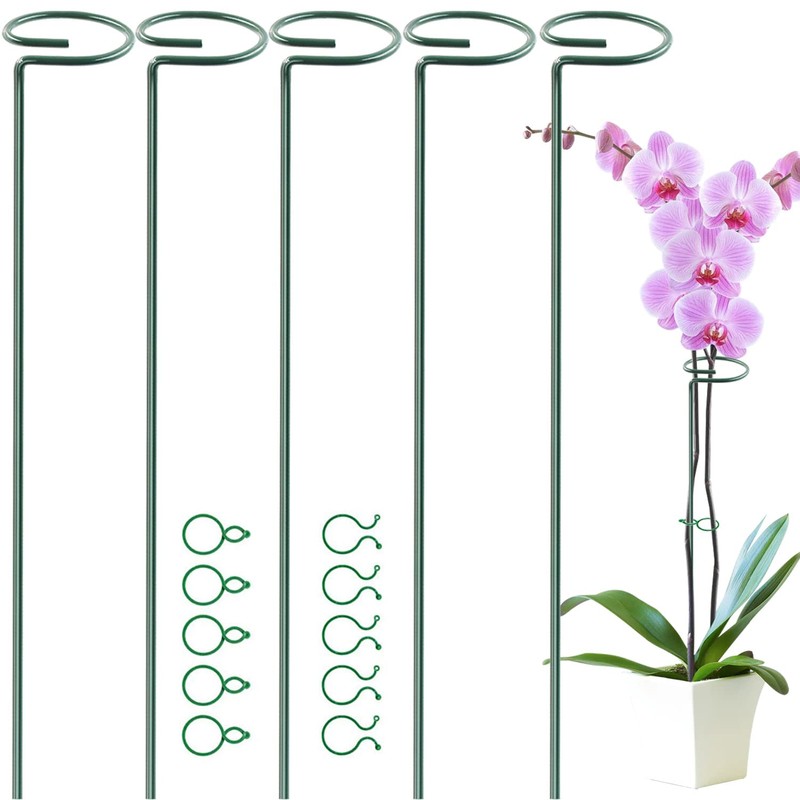 HiGift 5 Pack Plant Support Stakes, Garden Single Stem Flower Support Stick Metal Amaryllis Plant Cage Support Rings with 10pcs Plant Clips for Orchid Lily Peony Rose Stem (40 cm/16 inch Long)