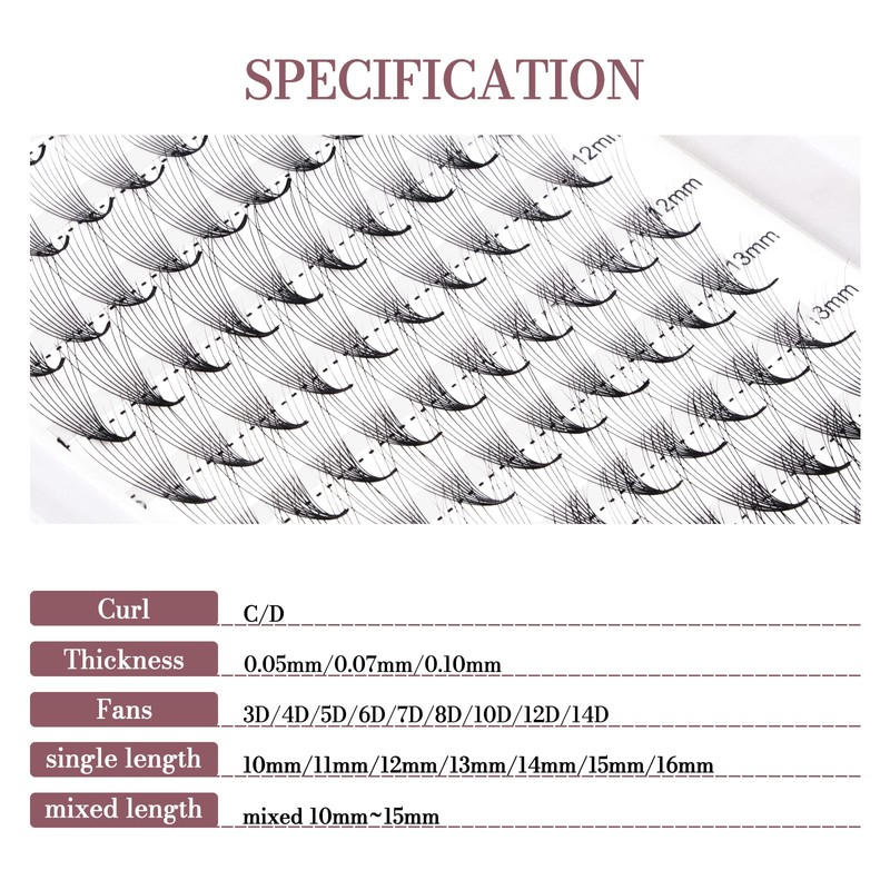 - ✨ SPECIFICATIONS: Volume premade fans eyelash extensions 10D 0.07 D 16 mm. 10 pcs per row,12 rows,total 120pcs fan lashes. we provide beautiful premade fan eyelash extensions 3D 4D 5D 6D 7D 8D 10D 12D 14D fan lashes for you. Makeable styles: hybrid lash extension premade, russian volume eyelashes, mega volume etc.