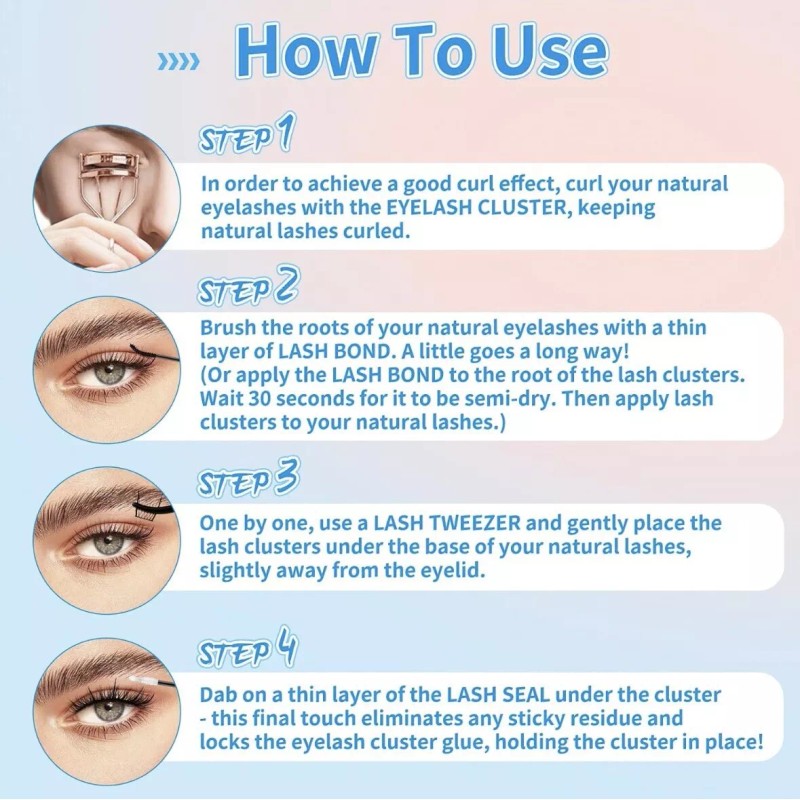 Grip the lashes with cluster lash tweezers, apply cluster lash glue to the root of the volume cluster lashes or gently brush your natural eyelashes with the lash bond, wear it to the base of your lash, and gently brush a layer of seal to strengthen the individual eyelashes.