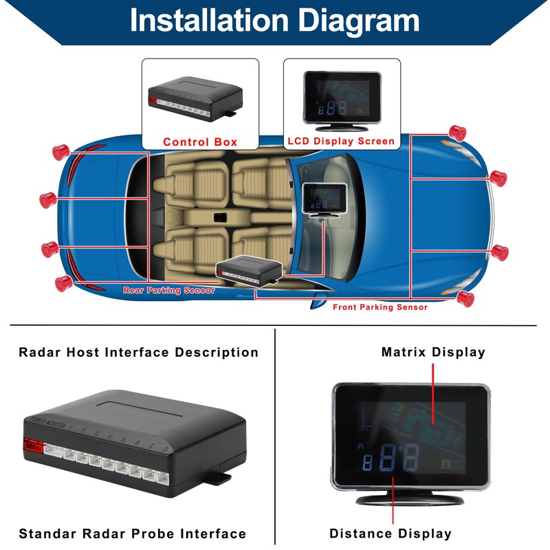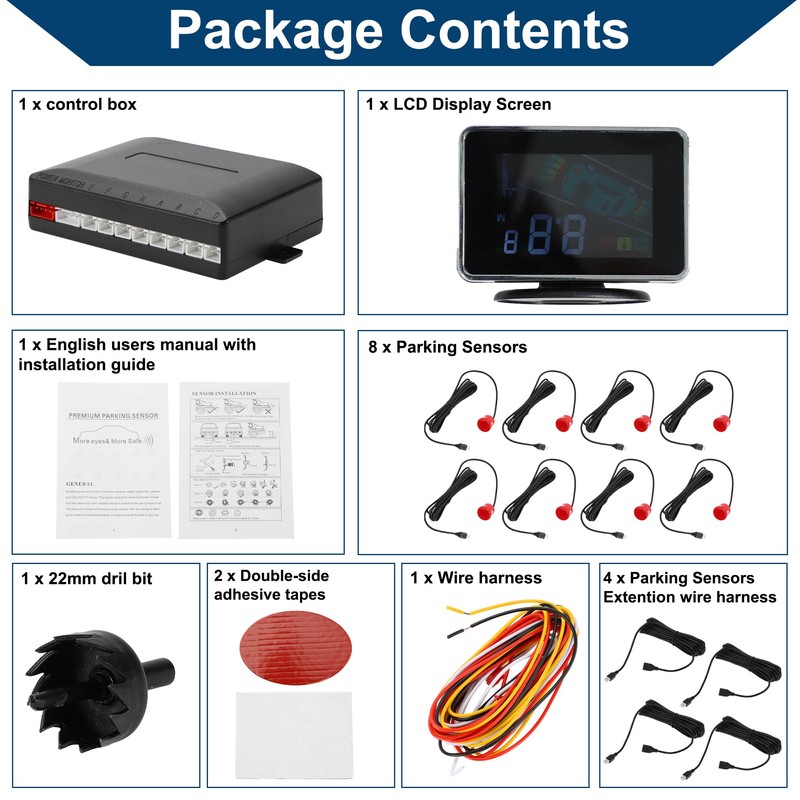 • What You Get:This parking sensor system includes 8 precision sensors, a control box, and a LCD display screen.