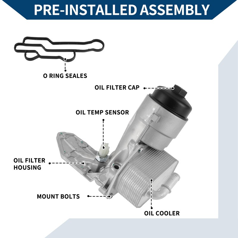 - PACKAGE LIST: 1 Pcs Engine Oil Cooler Assembly. Which is a pre-installed assembly includes Oil Cooler, Oil Filter Housing, Oil Filter, Sensor.
