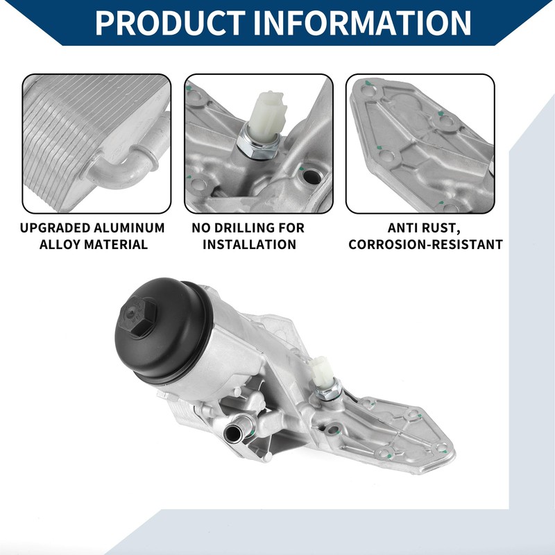 - PRODUCT INFORMATION: Engine oil cooler assembly is made of aluminum alloy and plastic that keeps it durable, reliable and functional accessories for running your car smoothly. The engine oil cooler is made of aluminum alloy material, which increases cooling efficiency, and corrosion resistance, prevents oil leakage, protects the engine, and longer service life