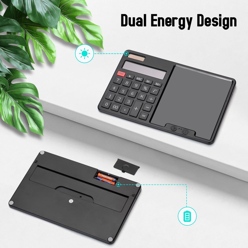 - 【Dual Power Supply System for Sustained & Stable Battery Life】Dual-mode Power for Calculator: The solar panel charges automatically in sufficient light, switching to two AAA batteries (included) in overcast or indoor environments. Smart power switching requires no manual operation, ensuring dual-power protection against sudden power outages during meetings.Energy-saving Design for Handwriting Pad: Directly powered by the calculator's batteries, low-power technology syncs the pad's battery life with the calculator, eliminating the need for extra batteries and reducing office accessory clutter.