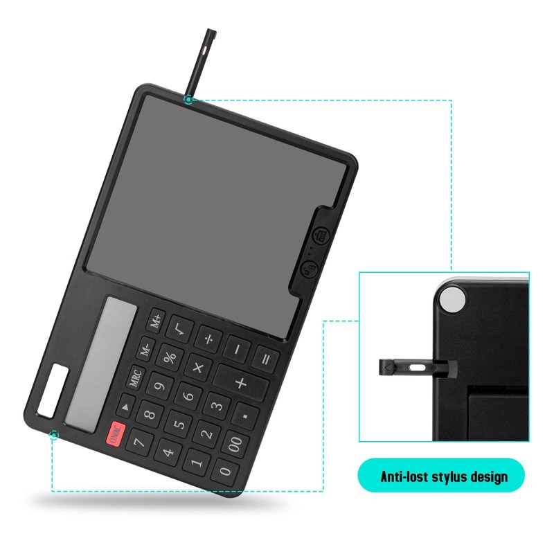 This handwriting pad calculator, specially designed for office scenarios, adopts an innovative split-screen layout with a calculator on the left and a handwriting pad on the right. The 12-digit digital display and the large 14×12.5cm handwriting pad each serve their purpose, complemented by a foldable stand on the back, two styluses, and features like a pad lock screen and one-key clear function. This allows simultaneous data calculation and idea recording, making it an efficiency tool for business operations, financial accounting, and meeting minutes. The calculator uses a dual power supply system of solar energy + two AAA batteries, while the handwriting pad is directly powered by the calculator's batteries—no extra energy needed—ensuring long-lasting and stable battery life for office use.