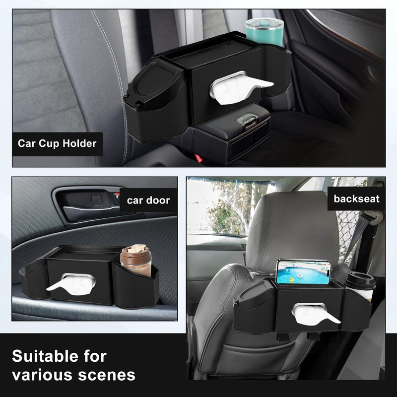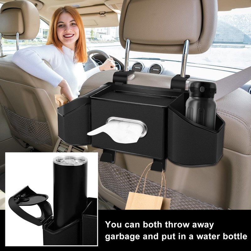- Multifunctional Storage for Car: Car backseat storage integrates 1 backseat drink holder, 1 dual-purpose trash can (which can be turned into a cup holder), 1 tissue box, 1 mobile phone rack and 2 hooks to meet various storage needs in the car and keep the car clean and orderly