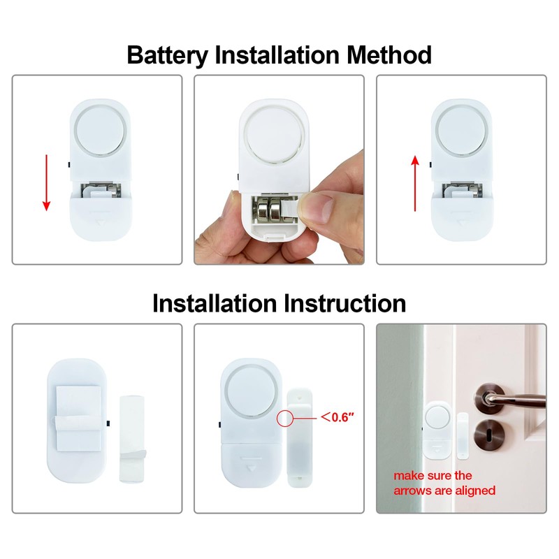 - 【User-Friendly】Equipped with a magnetic sensor switch that detects the opening and closing of your door or window. Simple stick installation process and operation with a press on/off switch for powering on/off. Insert three button cells (batteries included) and tear the double-sided adhesive located at the back of the alarm to paste on your desired position.